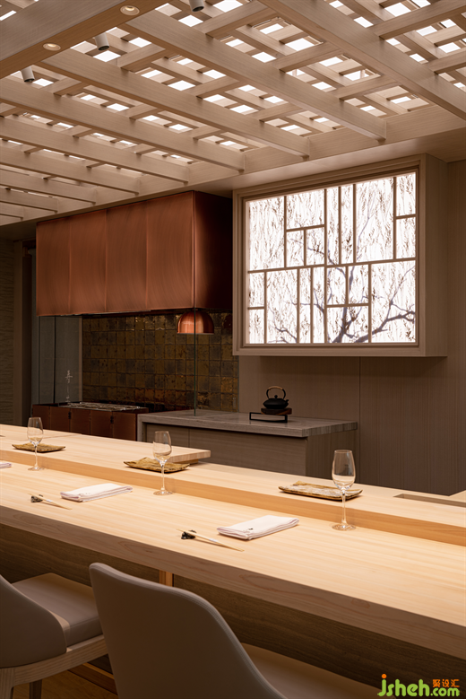 花見之意為"賞花”,名字源于其獨(dú)特的窗景。這個(gè)包間擁有寬敞的玻璃窗,天花采用現(xiàn)代設(shè)計(jì)手法,模擬樹枝交錯(cuò)、陽光灑落的自然光線,增添了房間的生機(jī)。
