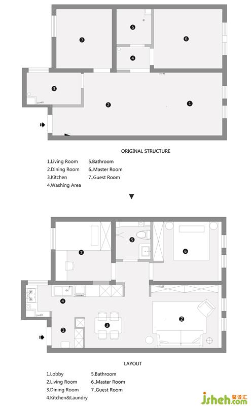 入戶轉(zhuǎn)折后是開放式廚房和餐廳 餐廚互動(dòng)性增強(qiáng)