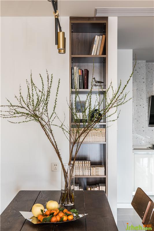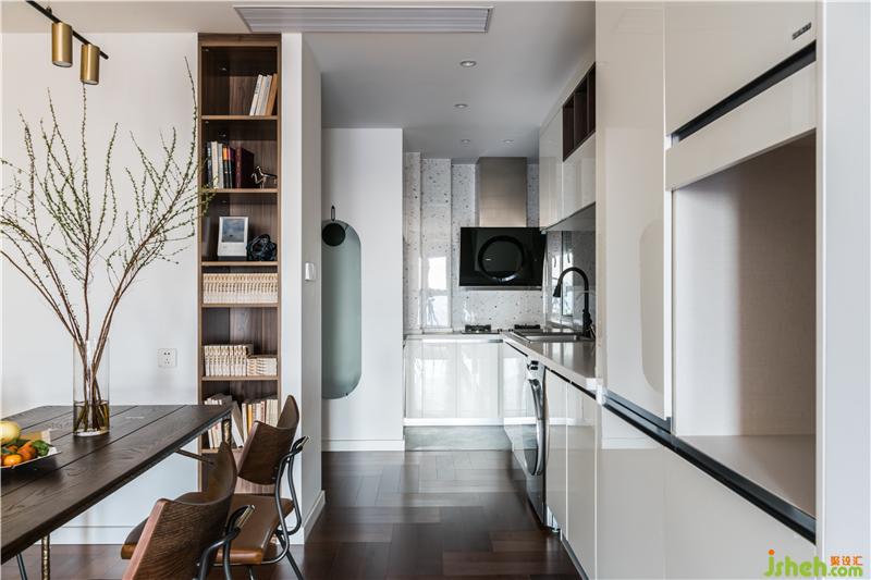 廚房、餐廳全開放式空間,整個(gè)空間以干凈的白色和純粹的材質(zhì)打造,沉淀感的木質(zhì)作為點(diǎn)綴穿插其中,北歐風(fēng)格卻使用簡約的元素,廚房墻面采用烤漆柜體和水磨石墻磚相結(jié)合,材質(zhì)碰撞但和諧,餐廳區(qū)域是書柜展示架結(jié)合木餐桌的設(shè)計(jì),金屬吊燈和餐廳的拼色墻主色調(diào)進(jìn)行了呼應(yīng)。