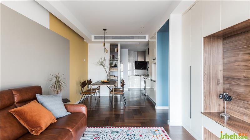 設(shè)計(jì)之初還有一個(gè)有趣的故事,我們的艷青設(shè)計(jì)師在了解過業(yè)主夫婦的習(xí)慣和職業(yè)后,在設(shè)計(jì)方案的配色上主動(dòng)的選用了比較冷靜,純粹的顏色,以此契合業(yè)主的職業(yè),但后來在第二次接觸中發(fā)現(xiàn)我們的業(yè)主對色彩的接受度是很高的,所以愉快的溝通之后,能發(fā)現(xiàn)這個(gè)家的確是色彩滿滿,清新俏皮的餐廳拼色墻,客廳沙發(fā)是飽滿的亮橙色以及抽象畫地毯,主臥的墻面和洗手間也是不單調(diào)的顏色,用色彩來減壓的家居設(shè)計(jì)法,大家也可以Get這一招~