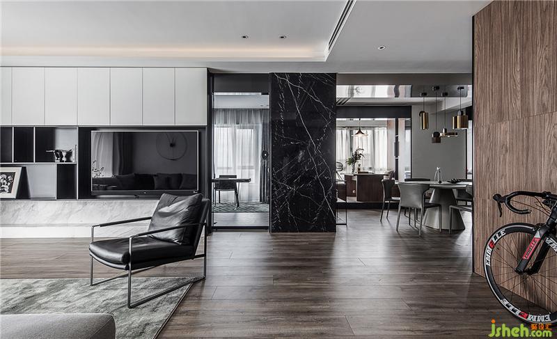 入戶將天然黑色大理石板作為空間背景,線條生動(dòng)色彩跳脫的裝飾畫(huà)和沙發(fā)椅作為視覺(jué)焦點(diǎn),材質(zhì)和顏色的對(duì)比突出整個(gè)空間沉淀的氣質(zhì)和高級(jí)質(zhì)感,同時(shí)也兼顧功能化設(shè)計(jì),右手邊的卡座方便坐下來(lái)更衣?lián)Q鞋。從玄關(guān)開(kāi)始,我們通過(guò)有質(zhì)感的材質(zhì)和色彩單品打造整個(gè)空間的情緒,平靜中帶有的灑脫,利落,更加上自然光線的自如利用,大面積的深色顯得毫不灰暗,而是一個(gè)充滿質(zhì)感和享受的沉靜空間。
