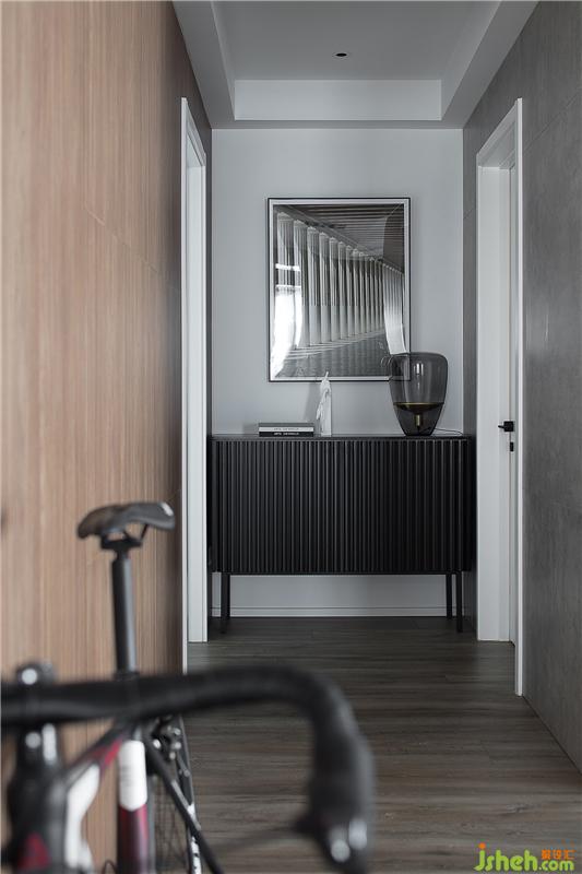 客廳的走廊和餐廳連接,大面積深色木飾面在這里的使用,和灰色水泥肌理墻板顯得十分和諧,柔和了這里區(qū)域空間的轉(zhuǎn)換,寬闊的走廊充分引入自然光線于室內(nèi),視覺(jué)也隨走廊而延伸,走廊盡頭的展示柜和藝術(shù)掛畫(huà),造成空間連續(xù)的視覺(jué)感知,有主有次的空間遞進(jìn)。