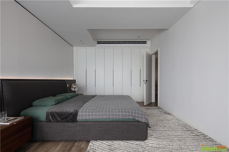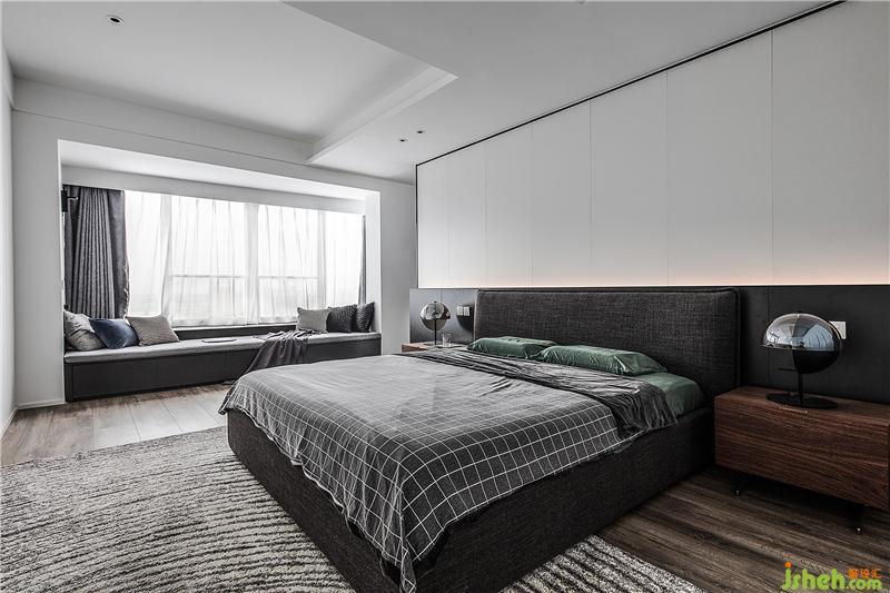 主臥的飄窗是改造后的陽臺,納入室內后整個空間十分寬敞,主臥背景墻是采用定制墻板,純白的部分結合隱藏燈帶,顯得十分有層次,深色系的床品和地毯結合白色的頂面框架,帶來視覺上的和諧美感。這里的主臥并不是封閉的一覽無余的,背景墻左邊是留出了一個進入衣帽間和主衛(wèi)的門。在不經(jīng)意處,暗藏玄機。