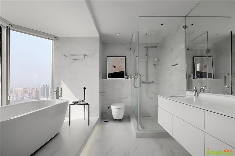 明亮的陽光透過大落地窗灑進這個純白浴室,地面與墻面都是大理石紋理的墻磚,結合白色頂面,整個空間顯露干凈無瑕的氣質,再加上落地窗浴缸的設計,白色雙洗手盆,讓人感覺誤入電影里的場景。大面積的純白里,入眼所見都是白色,沒有太多華麗的修飾,白色就是美的另一個表達。