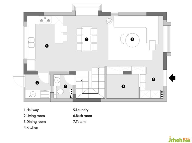 入戶的轉(zhuǎn)折放下了一個定制的玄關(guān)柜,容納日常鞋子物品收放需求,視線轉(zhuǎn)折后即是一個干凈沉穩(wěn),又柔和的公共區(qū)域。一樓公共區(qū)域的布局借助良好的采光和改造,構(gòu)建了一個對稱的格局,左邊是客廳休閑區(qū),電視背景墻放在沙發(fā)區(qū)對面,而在白色隱形門里又是一個隱蔽的客臥;右邊則是餐廚區(qū)和洗衣房,開放式的廚房結(jié)合餐廳、島臺,開放空間十分流暢。
