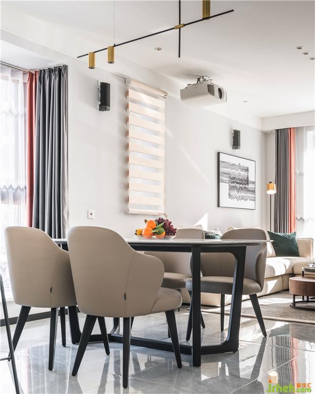利用無墻體阻攔,空間開闊明亮的布局,把餐廳放在了休閑區(qū)和廚房的中間,這也是常使用的動線安排手法,好用方便,令人舒適的點是借助落地窗戶,餐桌在這里正對著窗外的景色,有著對稱的外景,陽光微風里,在這里用餐的心情可以非常愉悅。