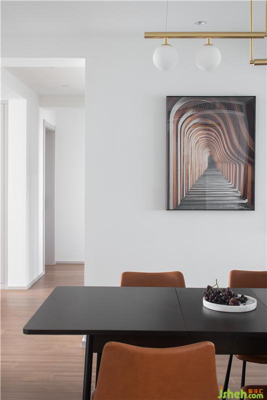 一個聯(lián)通的走廊,流暢串聯(lián)起來餐廚空間與客廳空間,使這里的空間感深邃。純白的射燈 頂面與女兒房的聯(lián)動門,豎線條也有如此美麗的體塊韻律。