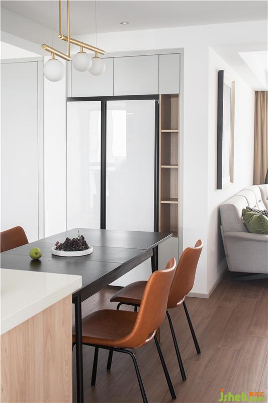 改變原始餐廳位置,將餐桌橫置,將入戶與餐區(qū)形成了流暢的過渡。同時廚房采用三聯(lián)活動門,全部打開時餐區(qū)與廚房又有一個更親密的聯(lián)通。