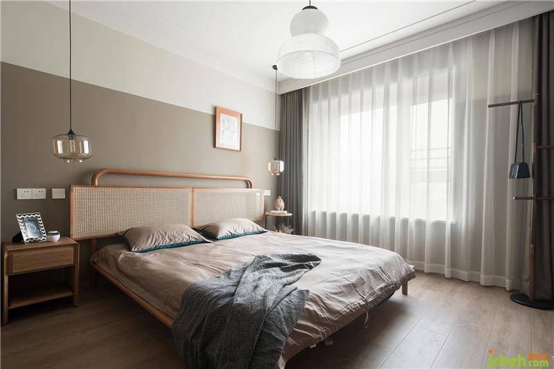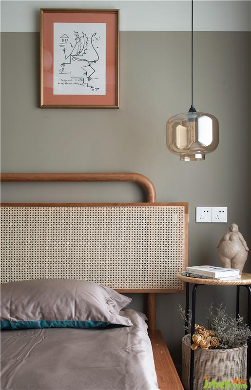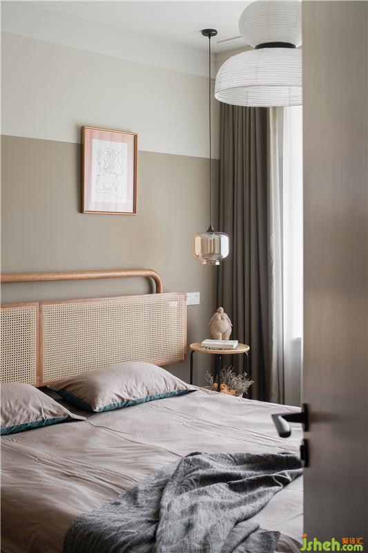 打開門,主臥印入眼簾。女主人喜歡度假的氣息,所以主臥也延續(xù)更加輕松、復古的調性。毫不猶豫的繼續(xù)選擇了棕色系墻面,與藤編的主臥床有了令人心動的色彩碰撞。
