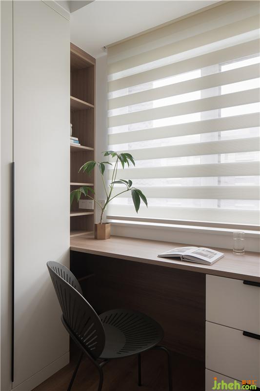這是白色簡約控一定會喜歡的書房設計,百葉窗+開放格書桌,明亮舒適。為了解決女業(yè)主的衣物收納,這里還做了與墻頂高的衣柜,在有限的空間里精心實現了辦公和衣帽間功能的兼顧。