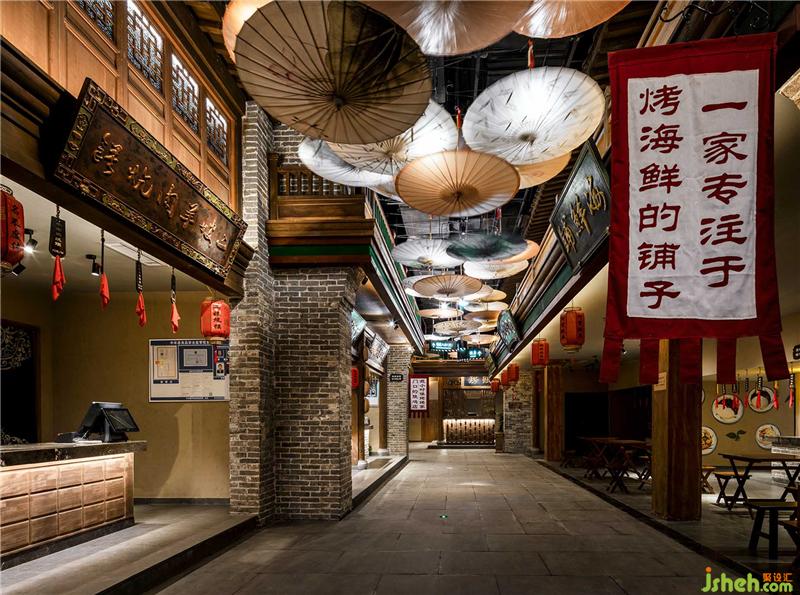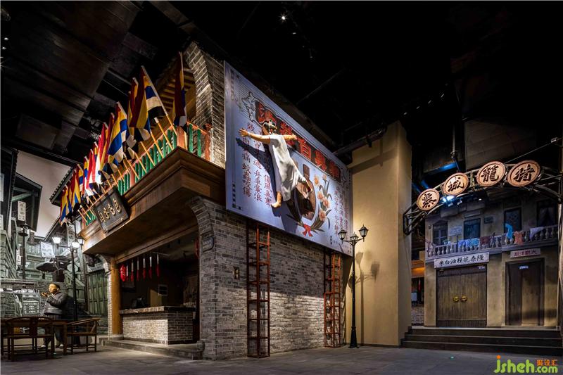 在一樓散廳、燈籠街等區(qū)域,我們大膽地運用了豐富的色彩來表現(xiàn)空間,從而打破了以往古城古建給人的傳統(tǒng)印象,使空間在講述歷史文化的同時,更具有特色和張力,成為了游客的記憶焦點。對于硬裝沒有考慮到的一些墻面和空間,我們結(jié)合電影場景,采用了原創(chuàng)墻繪等形式,既彌補了硬裝細節(jié)上的不足,又創(chuàng)造出了氣勢恢宏的劇場效果。