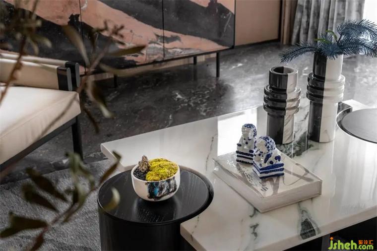 以皮革沙發(fā)、窗簾為畫布,以大理石桌面為畫布,樣板房設(shè)計(jì)以光潔地面與舒適地毯為畫布,以各類陶瓷為畫布,以實(shí)際畫布為畫布,形狀各異、材質(zhì)不盡相同,潑墨、灑墨、點(diǎn)墨……或輕或重,肆意而游刃有余。