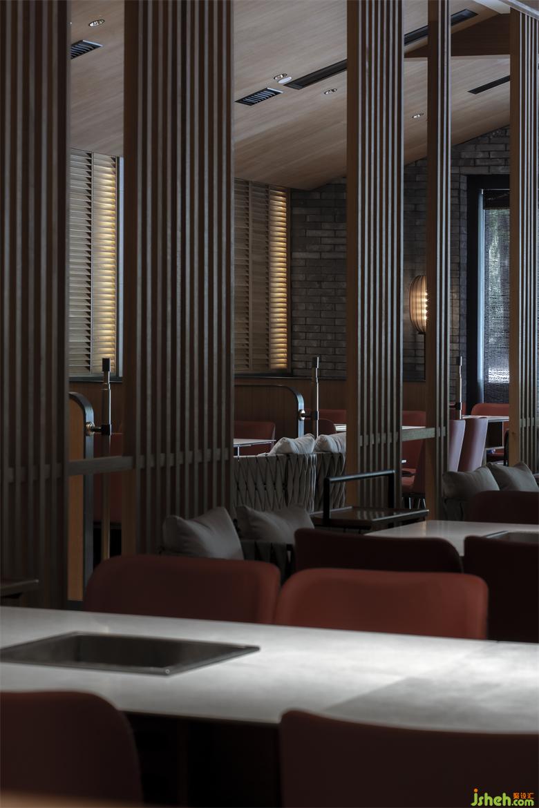 大廳木格柵左右兩邊,成都餐廳設(shè)計(jì)了不同形式的就餐空間,左側(cè)為卡座區(qū),使用與大廳材質(zhì)統(tǒng)一、形態(tài)各異的木質(zhì)隔斷,打造豐富變化的用餐環(huán)。