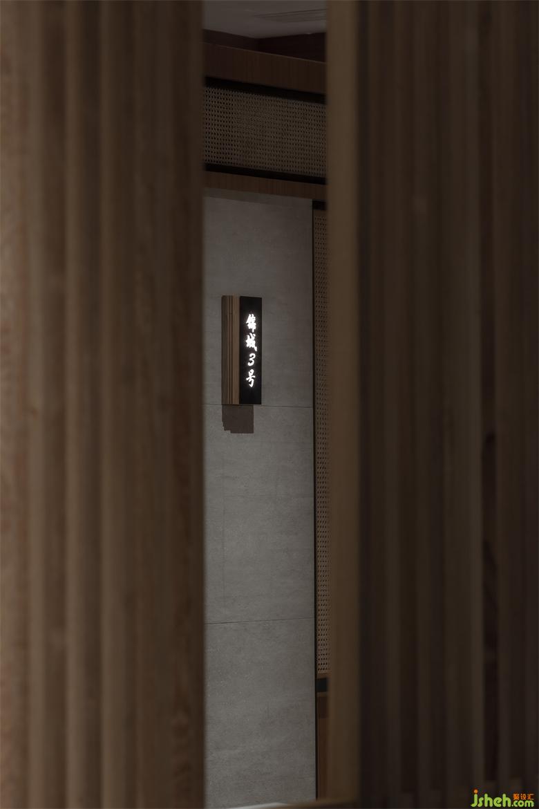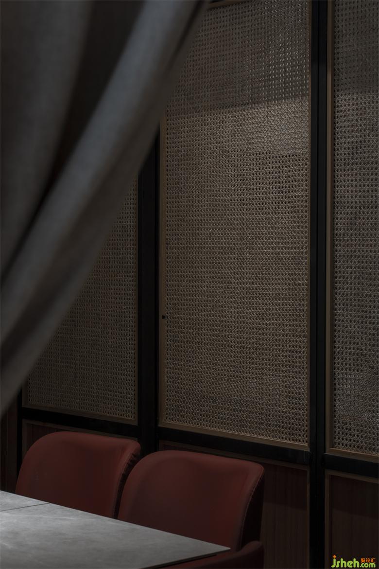 大廳右側(cè)為獨(dú)立的包房區(qū)域,玻璃窗與竹藝編制活動(dòng)推拉門相結(jié)合,成都餐廳設(shè)計(jì)兼顧了私密性與空間的通透性。