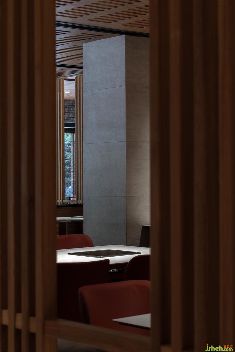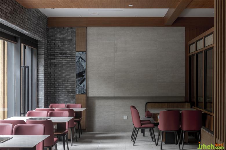 成都餐廳設(shè)計(jì)中盡可能的避免裝飾上堆砌的做法,用更精準(zhǔn)的材質(zhì)變化去定義空間。通過中間木隔斷這種看似單一的手法制造「空間的統(tǒng)一」,搭配家具紅/灰的色調(diào)保留了錦城印象「空間辨識(shí)度」。