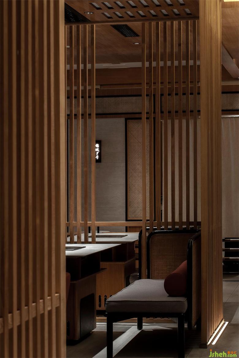 保留特色同時也要滿足推陳出新的目的,融入年輕新潮的氛圍??此泼芗哪靖駯?,采用了「空間頂面透光」的手法,打造光與影的意境。成都餐廳設(shè)計格柵頂部透光方式將光線引入,漫散的光影,使空間層次渲染豐富。火鍋熱鬧的氛圍中,融入光影動勢,使空間更加廣闊并帶來生機(jī)的新鮮感。