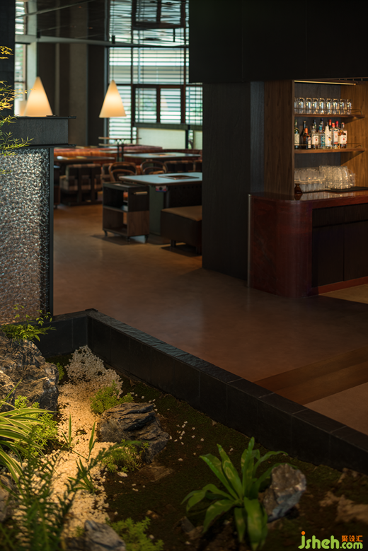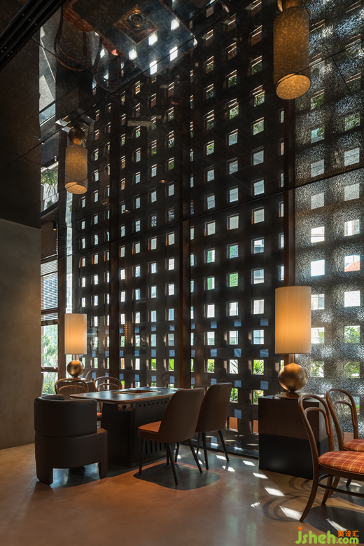 空間層次上的高低處理、多種透與不透、隔斷介質(zhì)的穿插, 火鍋店設(shè)計(jì)超常規(guī)尺度編制隔斷,仿佛捕夢(mèng)網(wǎng),與紅色異形石材地拼、充滿肌理感堆積木料、秩序感陣列吊燈形成獨(dú)特的空間語(yǔ)言體系。類似電影的跳接剪輯、蒙太奇手法,這些手法的運(yùn)用讓空間帶有些許電影氣質(zhì),如夢(mèng)如囈語(yǔ)的電影旁白般貫穿始終,滲透著設(shè)計(jì)師對(duì)“夢(mèng)”的理解。