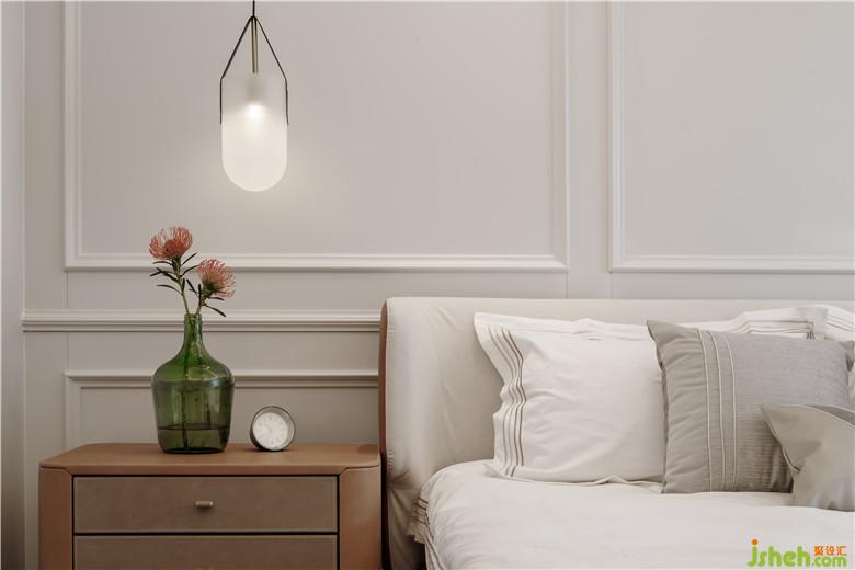 次臥硬包背景,大小不一,井然有序。與幾何形狀的地毯形成反差,只一副高空俯瞰的山脈畫作,便起到了吸睛的作用。宛若星辰的下掛燈,仿佛給予我勇氣,指引我們找到愛的方向…