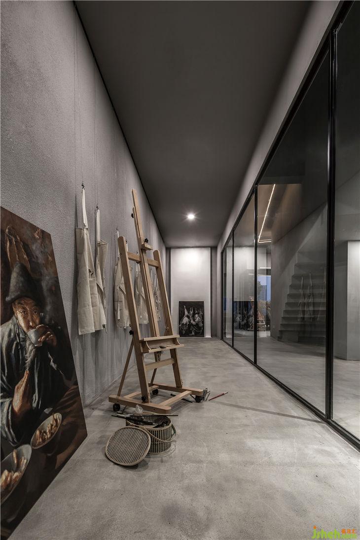 我們認(rèn)為空間、環(huán)境與人的關(guān)系環(huán)環(huán)相扣,能夠感染人們的情緒。在整個(gè)建筑中特別選擇了水泥與木頭的材質(zhì),來(lái)盡量放大空間的質(zhì)感,為人們營(yíng)造出一種靜謐又自在舒適的氛圍。建筑的極簡(jiǎn)性、構(gòu)造的清晰度和材質(zhì)的純粹度,體現(xiàn)出空間的藝術(shù)氣息與極致的工匠精神。設(shè)計(jì)師別出心裁地將入口處做了內(nèi)退處理,留出一段空間作為入戶花園,擺放了一些綠植以及雕塑作為點(diǎn)綴,引發(fā)來(lái)訪者強(qiáng)烈的好奇心,想要進(jìn)去一探究竟。
