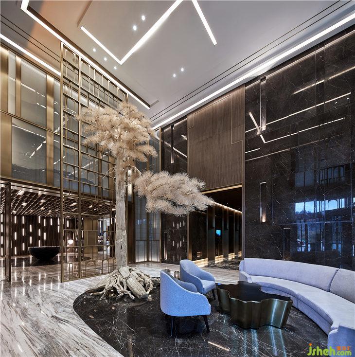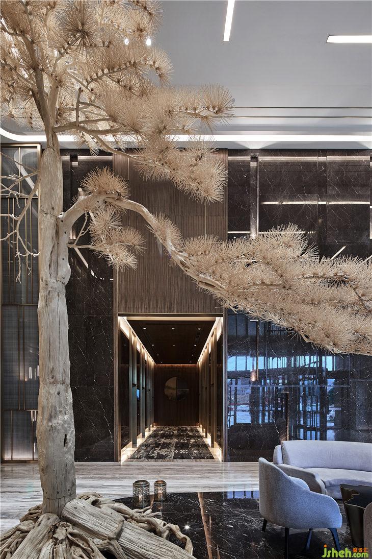 酒店大堂入口處兩側(cè)的門由傳統(tǒng)木門演變而來,地面的大理石是云朵的形態(tài),頗有“高山流水”的意境。一顆巨大松樹下是沙發(fā)休息區(qū),置身其中,有著“只在此山中,云深不知處”的閑情逸致。