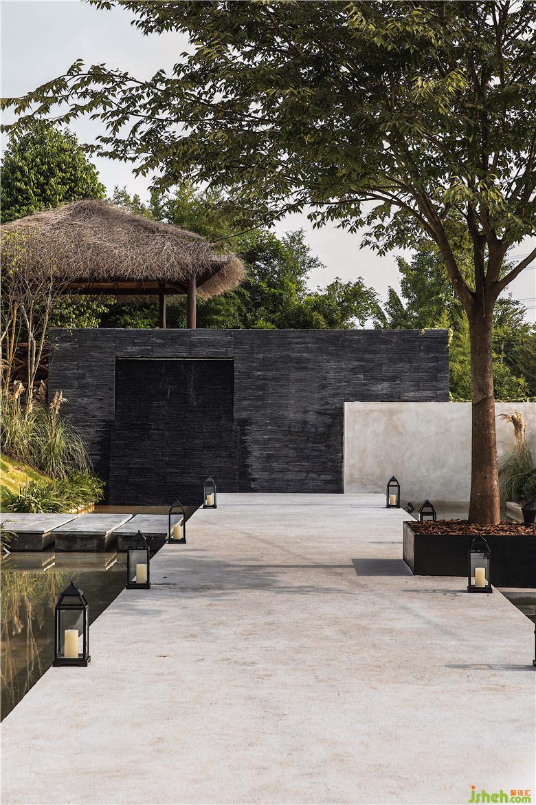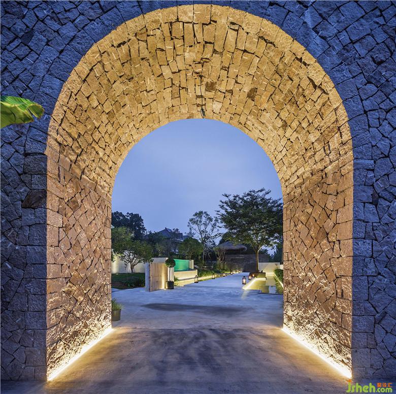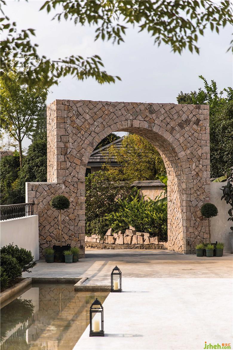 入口處的石砌拱門極具儀式感,一塊塊經(jīng)過(guò)人工手工切割堆積而成。長(zhǎng)長(zhǎng)的白色汀步走道,仿佛是一條浮在水上的路,映照著城堡中護(hù)城河與橋的元素。伴隨著水流聲,蟬鳴聲,風(fēng)吹過(guò)樹(shù)林的沙沙聲,迎接著遠(yuǎn)道而來(lái)的客人,一切生命都仿佛在流動(dòng),散發(fā)出自然的力量。