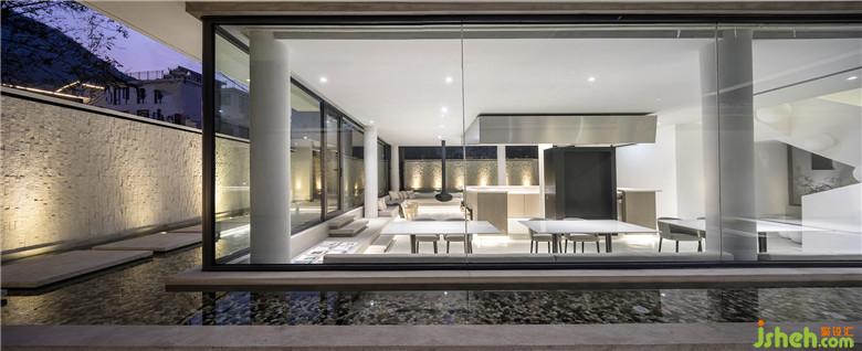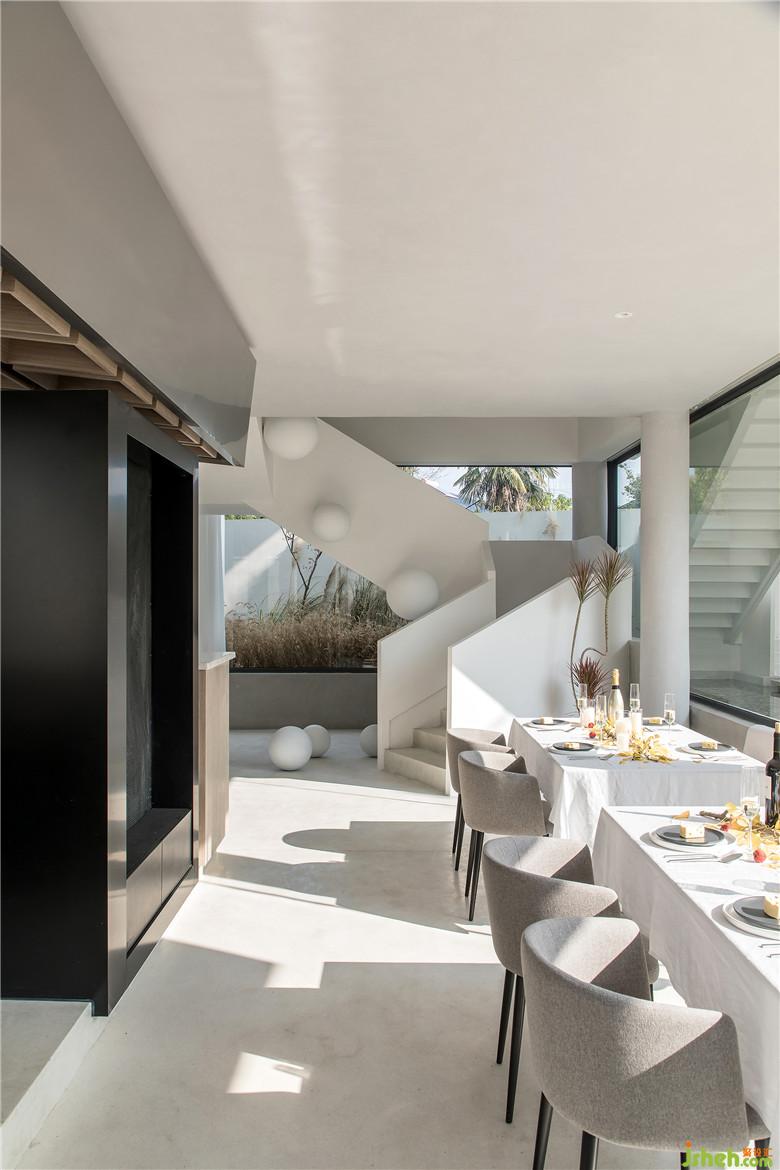 步入室內(nèi),將一層公共空間做了下沉處理,底層架空,通過柱子進行支撐讓墻體解放,猶如一根根樹干,空間瞬間變得通透、寬敞,四周大開窗的玻璃設計將景色引入室內(nèi),以景喻情,充滿了自然斑斕的色彩。