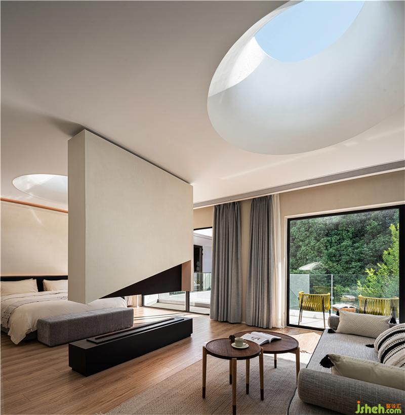 民宿主希望在這樣一片自然環(huán)境中,建筑能夠盡大可能地擁抱自然,純澈,透明,設計師沈墨與陶建浦便以“杉里看云,云里看山”為主題,打造出了一個全新的建筑。