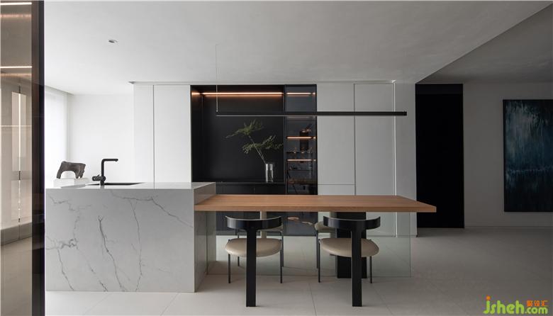 在原有格局基礎(chǔ)上,為了滿足主人不同的用餐需求,設(shè)計(jì)師劃分出一個(gè)西廚區(qū)域,灰色玻璃柜可以收藏酒品、餐具等。