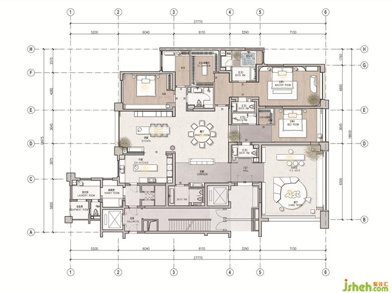 起居空間分為三個(gè)房間和一個(gè)助理房,其中為主臥重新做了分區(qū)規(guī)劃,擁有衣帽間以及spa空間。