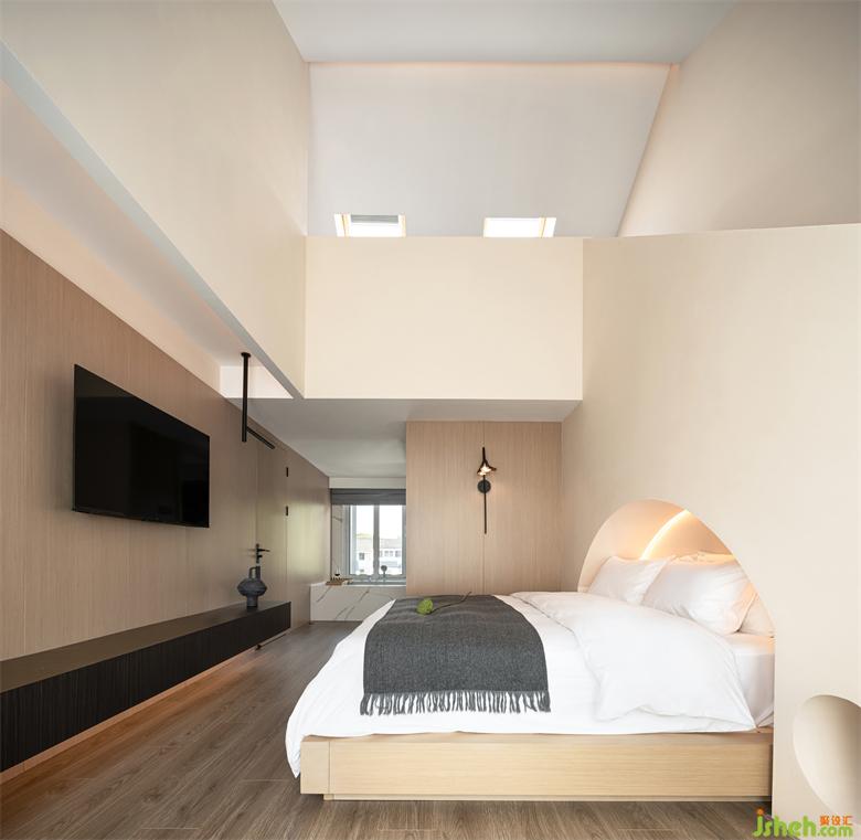 保留原本屋頂?shù)钠旅娼Y(jié)構(gòu),loft房間將空間每一處都利用到極致,燈光與空調(diào)藏入結(jié)構(gòu)中,最大化地讓空間變得極簡(jiǎn)純粹。