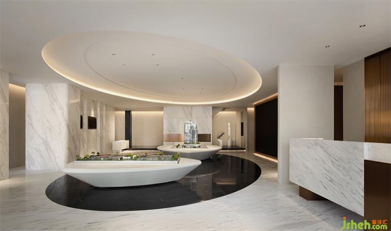 售樓處設(shè)計(jì)圍繞著木質(zhì)造型體塊展開動線,分為展示區(qū)、咨詢區(qū)、VIP區(qū)、接待區(qū)、后勤服務(wù)區(qū),全方位融入了游輪度假的生活方式,空間傳遞著游輪航行大海的豐富與靈動。