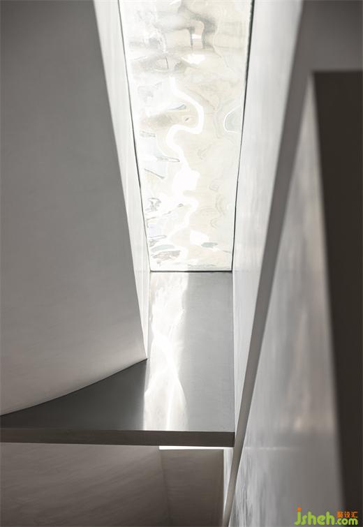 光的造型千變?nèi)f化,是來自大自然的藝術(shù),為居家生活帶來極大的詩意。臺州別墅設(shè)計師保留原始梁柱,將頂面處理成弧形的建筑體塊,與電視機墻體產(chǎn)生空間關(guān)系,于此同時樓板被打通,變成水景天窗,讓光線自由進入空間中,隨著水面的波動整個空間仿佛充滿了光影的律動感。
