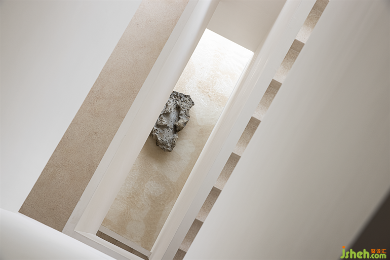 The sculptural stairway further enhances the artistry of the space, placing taihu Stone and lake water into the space to form a miniature landscape, as if in the beautiful scenery.