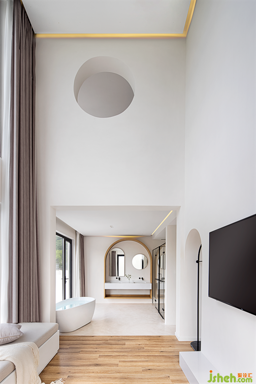 loft空間以縱向的方式連接著天空與海面,化繁為簡,猶如一朵浮云置于空中,蘇州民宿設(shè)計(jì)給住客留下了無盡的想象空間。