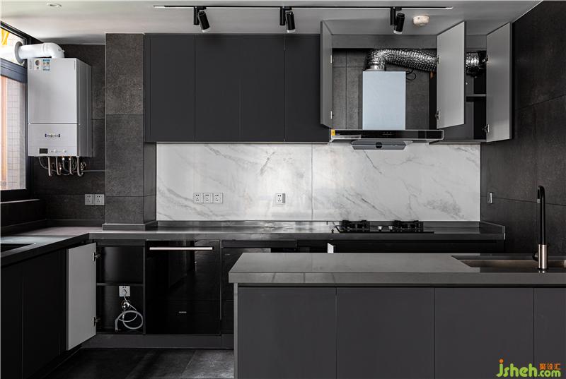 屋主當時告訴我們,希望廚房功能一定要強大,因為使用頻率較高,還需要有類似廚島的功能,女屋主會經(jīng)常做西餐和一些西式甜點。于是,室內(nèi)設計師將其做成開放式廚房,增大空間視覺效果。