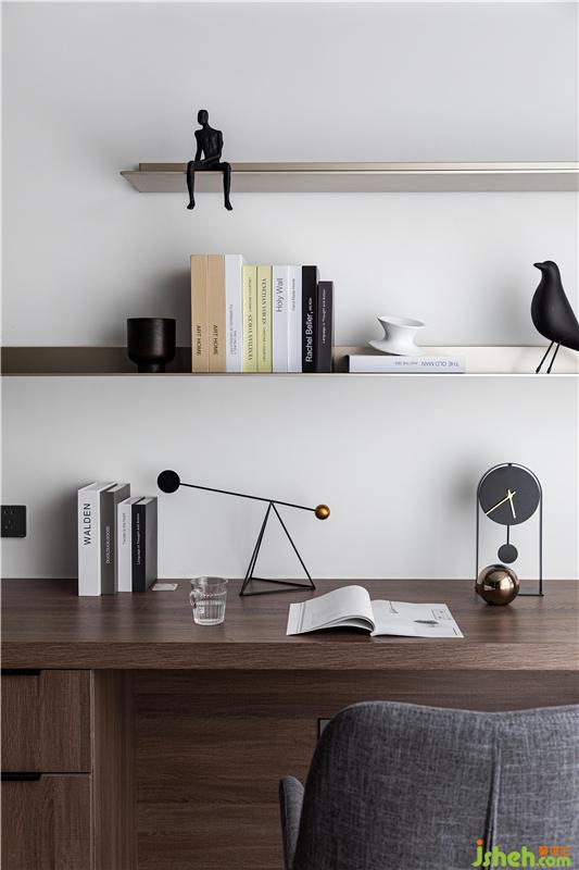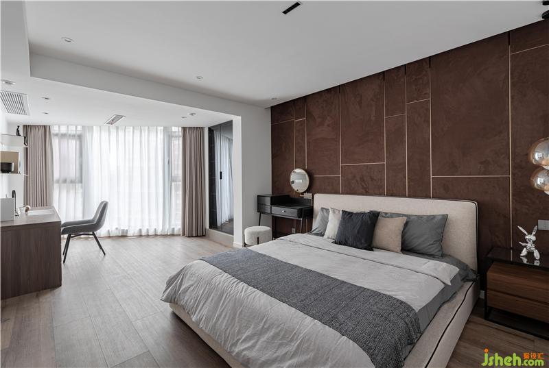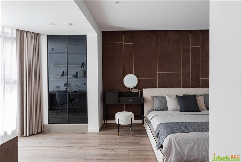 陽臺融入室內(nèi)后,做成了書房區(qū)域與主臥相連,并增大了空間視覺效果和實用性。主臥床頭則采用了金屬線條+硬包飾面作為裝飾,提升了空間的品質(zhì)感。關(guān)于衣帽間,室內(nèi)設(shè)計師將柜體與墻面采用了高低差收口,牢牢落實整個設(shè)計落地的細節(jié)。