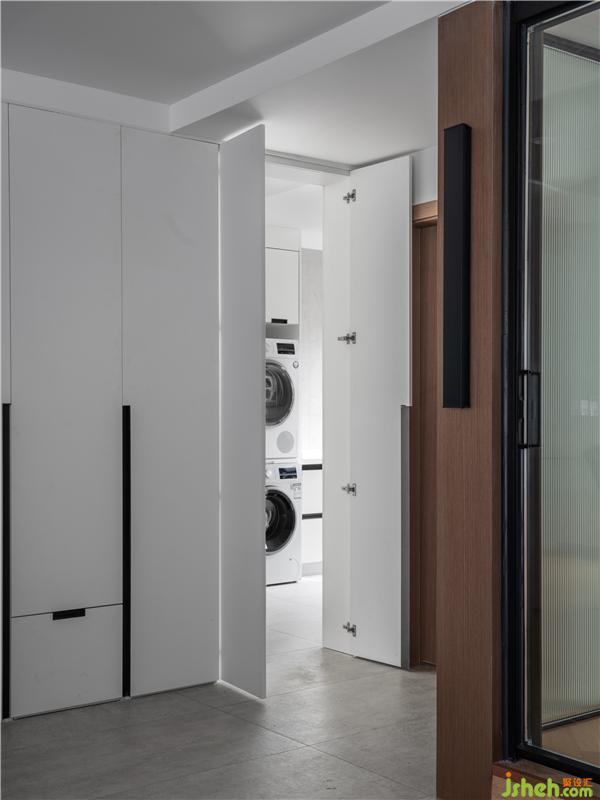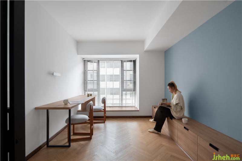 于是我們將書房門洞移位至正對(duì)客廳,拆除部分墻體使用長(zhǎng)虹玻璃與玻璃推拉門將其替代,既是獨(dú)立的空間還能補(bǔ)充客餐廳區(qū)不足的光線。保留書房主要功能,讓屋主后期可以隨心所欲給其填色,慢慢把房子住成家的模樣。