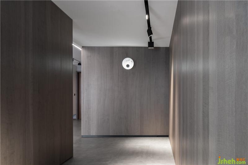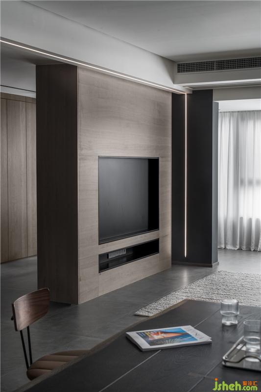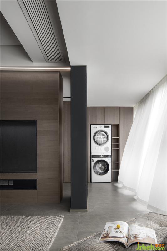 以電視背景墻為界向四周延伸,重新組合為了一條回字形動(dòng)線,無論是換衣物、洗衣物、亦或是收納物品,家居設(shè)計(jì)都減輕了屋主的工作量??蛷d與衣帽間的柜體分別使用的了兩種不同的木材,衣帽間選擇的深咖色梧桐木粗獷與安全感并存。而客廳的柜體集收納與展示功能于一體,可收納客廳的雜物,同時(shí)展示屋主的收藏,因此選擇了更溫潤的橄欖黃栓木。