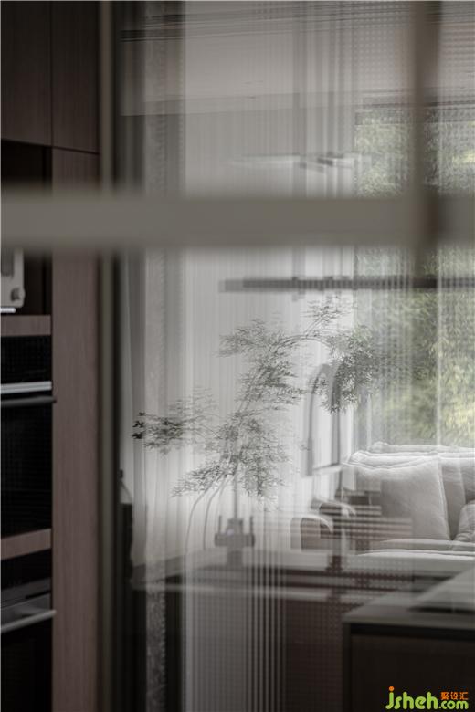 “侘寂”美學的本意在于營造沉靜的氛圍,而餐廳則想更多呈現(xiàn)出一種市井煙火的氣息,空間產(chǎn)生對比的同時也具有戲劇性。島臺+餐桌整個區(qū)域,看似簡潔的造型,為了達到橫平豎直的一一對應。