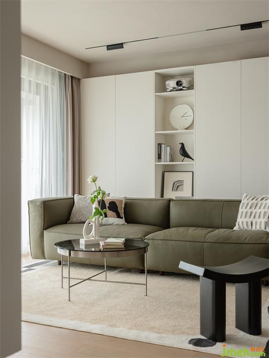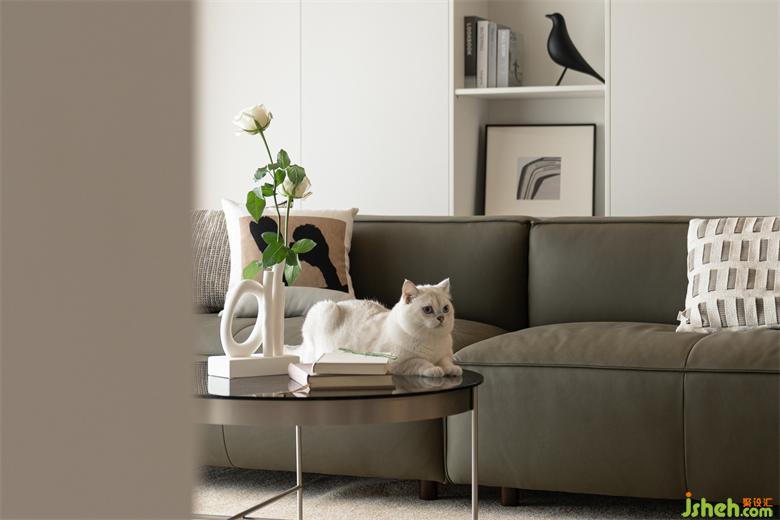沙發(fā)款式低矮簡潔,絨布搭配綠色為空間注入復(fù)古格調(diào),在大面積淺色調(diào)中作為加強與點綴,沉淀出客廳的優(yōu)雅與愜意。