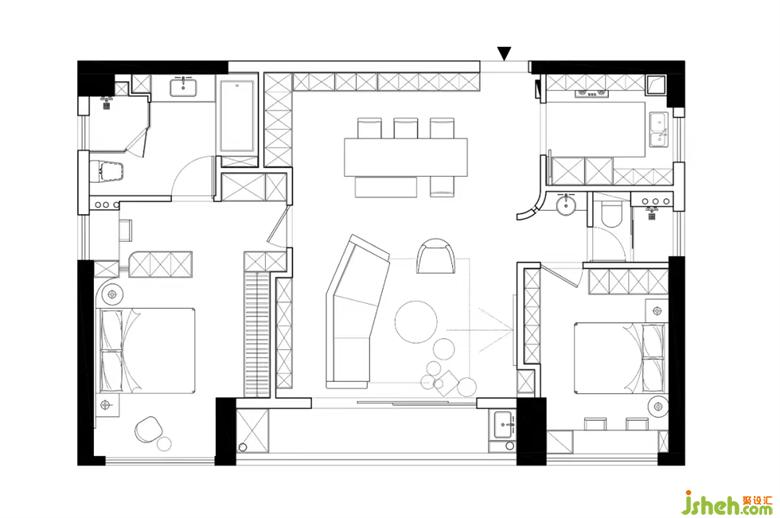 #1.非常罕見的對稱式戶型,空間利用率極高,改造空間很足,戶型缺點也很明顯,南北不通透,流動性較差;
