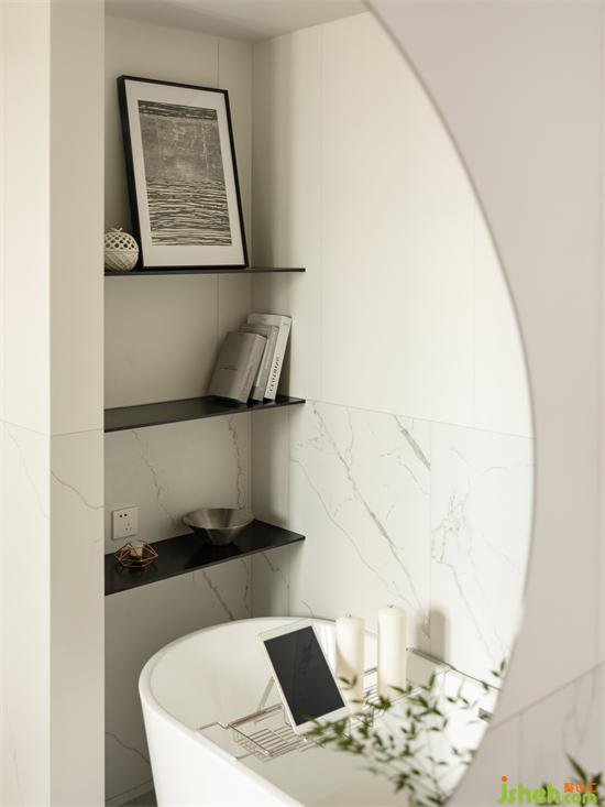 浴缸角落打造三層輕薄擱板,黑色鐵藝材質(zhì)簡約時尚,烘托情調(diào)滿滿的泡澡氛圍,收納方式妙而不俗,完美隱匿且不失質(zhì)感,家裝設(shè)計將功能性從細(xì)節(jié)上優(yōu)化,共造出彩的家居生活場景。