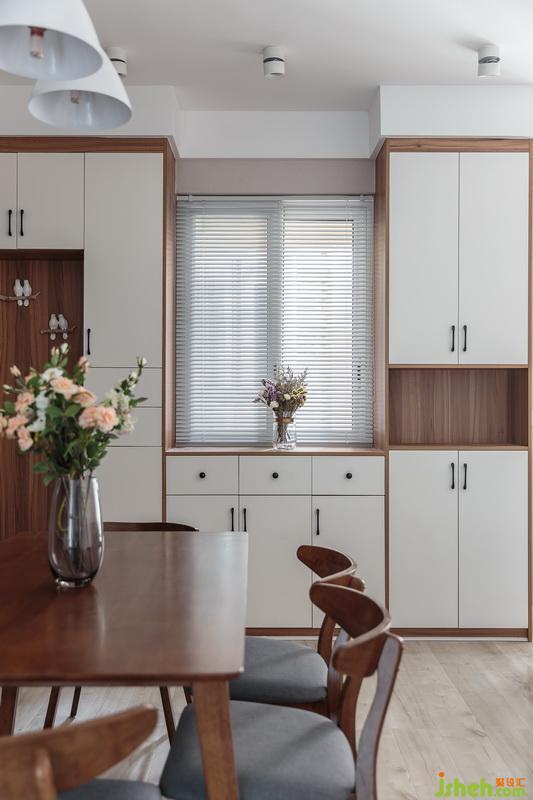 從餐廳望向入戶量體,正好留出窗口輔以百葉,大面積柜體即是入戶收納也是餐廳背景。