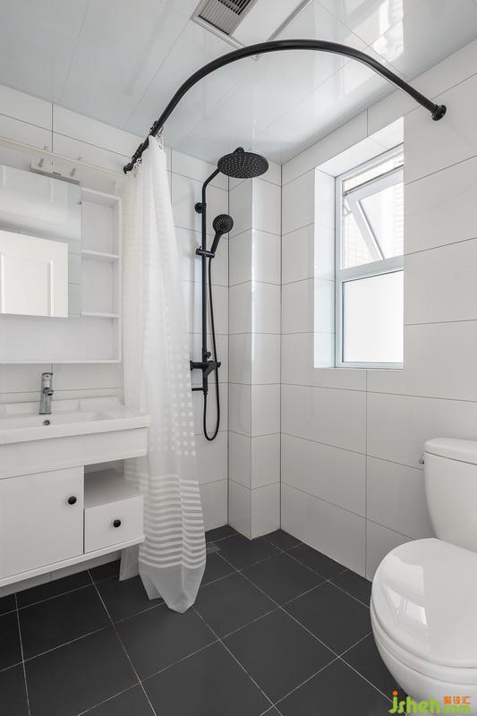 衛(wèi)生間,深灰色地磚搭配白色墻磚,室內(nèi)設(shè)計(jì)師用浴簾取代玻璃淋浴間。