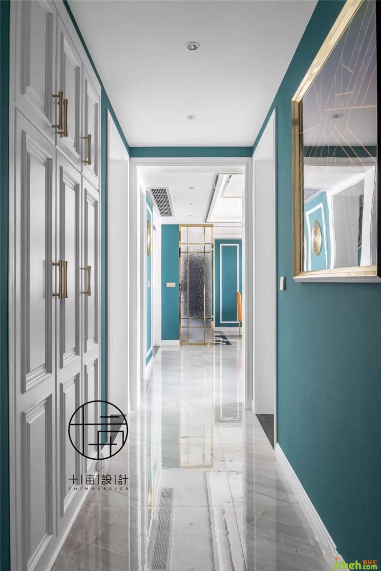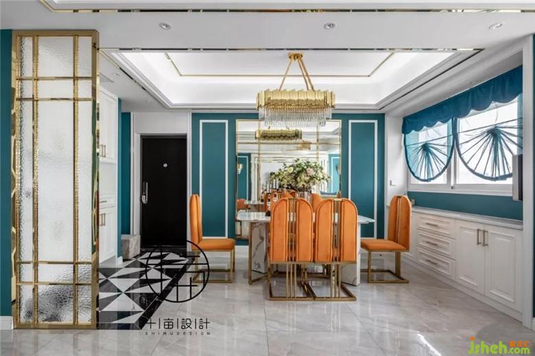 整體的元素定義在Art Deco(裝飾藝術(shù)),玄關(guān)地磚用了幾何的元素,餐廳鏡子是茶色一是和金屬色統(tǒng)一,二是餐廳空間并不大從視覺上讓空間更開闊,磨砂玻璃也是和金屬相嵌,呼之欲出的浪漫奢華氣息。