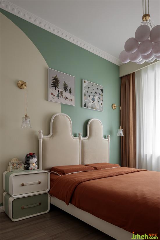 綠色和白色是清新脫俗的色彩搭配,床的造型讓人眼前一亮,氣球造型的吊燈是小朋友一個個的幻想與夢,十畝家裝設計墻上充滿童趣的掛畫來自夢里的童話世界。這里的童年時光如此美好。