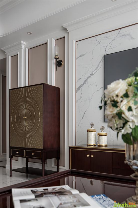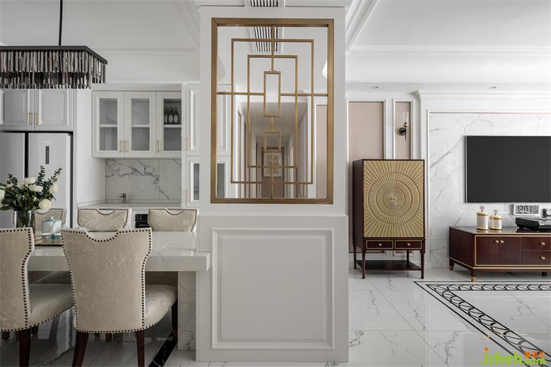 白色系的設(shè)計(jì)讓餐廳更加潔凈、明朗,亮點(diǎn)在于餐廳與客廳間的隔斷,金色邊框提升了空間亮度,家裝設(shè)計(jì)豐富了色彩氛圍,整體效果更加自然和諧。