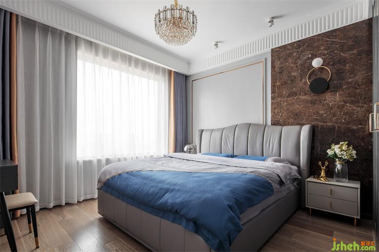The highlight of the master bedroom design is in the background wall, half of which is the bright surface and half is the soft bag. Like couplets, it has a unique symmetrical beauty. The first couplet is: Porcelain mirror and streamer fly together, the second couplet is: tenderness and dreams come together.