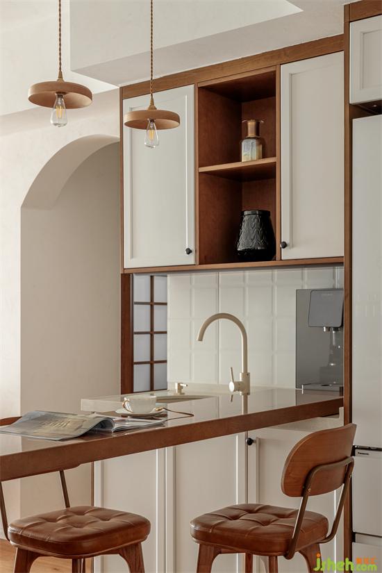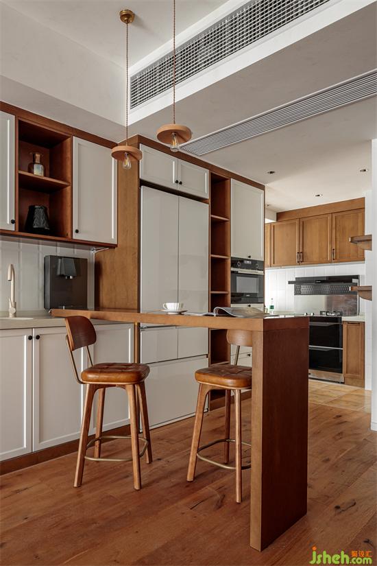 改變戶型原本廚餐分隔的傳統(tǒng)樣式,根據(jù)屋主的生活習(xí)慣,用全開放式廚房設(shè)計,家裝設(shè)計搭配靠墻吧臺,極大增強(qiáng)了空間的實用效果和視覺效果。