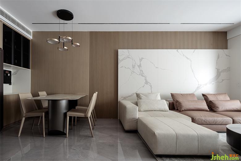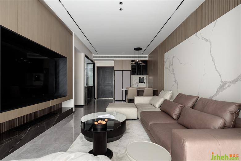 客廳動(dòng)線自由通透,無(wú)主燈設(shè)計(jì)讓整個(gè)空間簡(jiǎn)潔明朗,電視墻以木色柜子,家裝設(shè)計(jì)配以暖光,家的氛圍感和溫度瞬間提升。